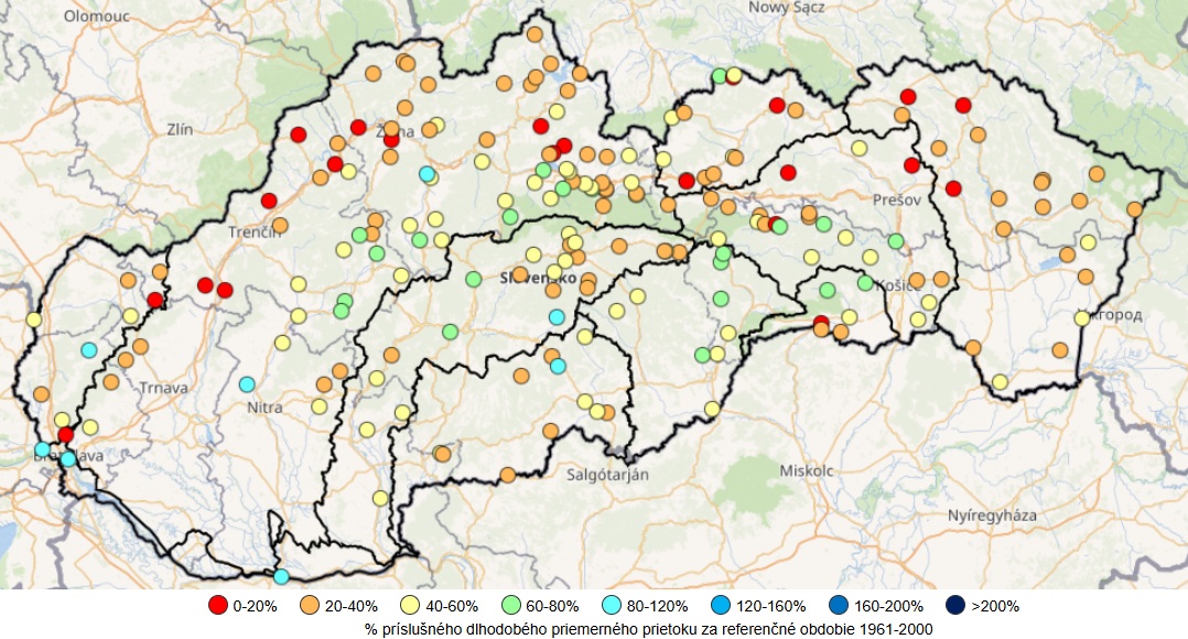 Z hľadiska posúdenia priemerných denných prietokov (Qd) na začiatku mesiaca v hodnotených VS boli Qd prevažne v rozmedzí normálnej (Q180-270d)* až podnormálnej vodnosti (Q330-355d) vo väčšine povodí. V povodí Bodvy a Bodrogu hodnoty Qd odpovedali hodnotám kategórii sucha (Q355-364d); miestami vo VS v oblasti Liptova a na severe povodia Dunajca a Popradu dosiahli Qd hodnoty kategórie mierne nadnormálnej vodnosti a vo VS v povodí Dunaja prevládali hodnoty Qd odpovedajúce kategórii nadnormálnej vodnosti (Q30-90d) (Obr. 2).