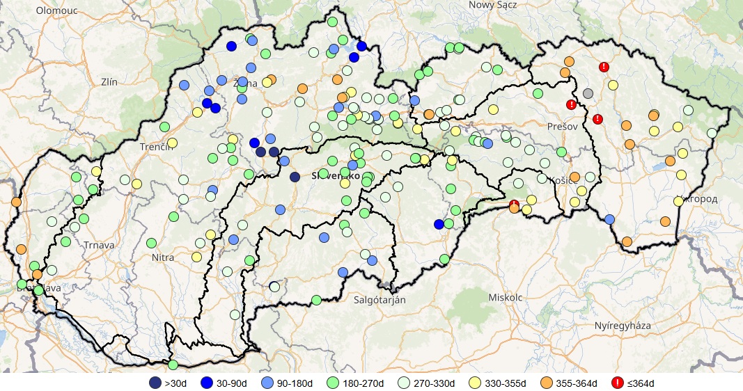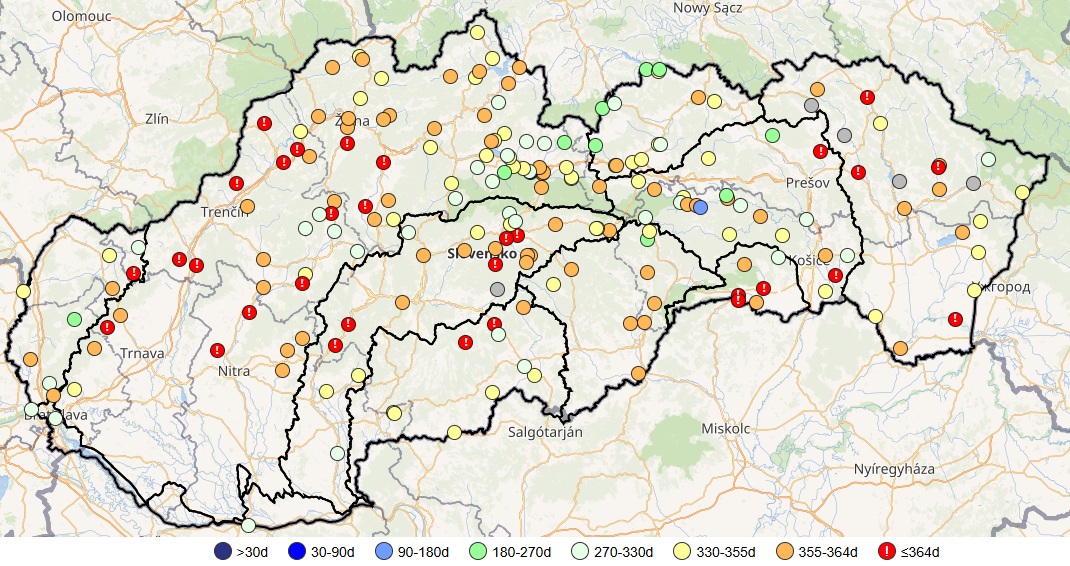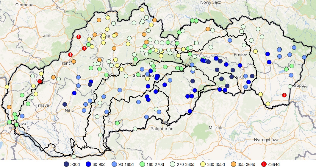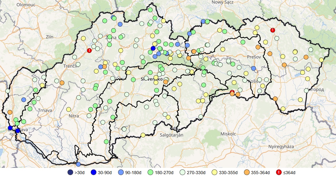 * Poznámka: M-denný prietok predstavuje priemerný denný prietok dosiahnutý alebo prekročený po M dní v zvolenom období. To znamená, že napríklad 355-denný prietok (Q355d) je hodnota, ktorá by v danom profile na toku mala byť menšia v priemere len 10 dní v roku (365 dní mínus 355 dní), po zvyšné dni roka by mala byť buď rovná tejto hodnote alebo väčšia. Za hodnoty blízke minimám (obdobie sucha) považujeme najmä hodnoty odpovedajúce Q355d, Q364d.