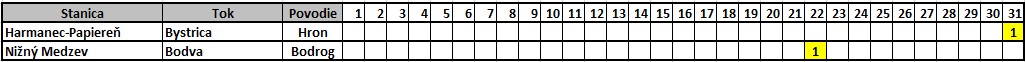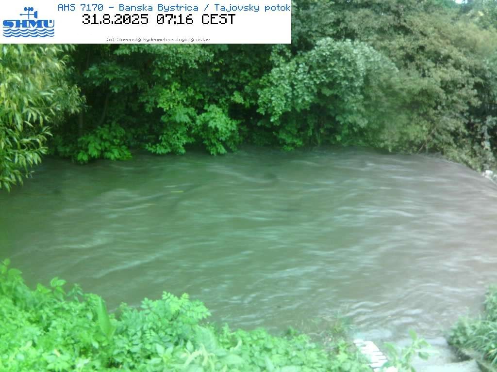V prvých dňoch mesiaca zasiahli výraznejšie zrážky predovšetkým povodia na západe Slovenska, výraznejšie vzostupy sme pozorovali len na menších malokarpatských tokoch. Hydrologická situácia na väčšine tokov bola ustálená až do predposledného augustového víkendu. V dňoch 21. a 22. augusta postupoval cez územie Slovenska zvlnený studený front, ťažisko zrážok sa nachádzalo najmä v povodiach v južnej polovici. Na nemalej ploche sa vyskytli 24-hodinové úhrny zrážok v intervale 50 až 100 mm (2). Vzostup až výrazný vzostup vodných hladín sme zaznamenali na tokoch v povodí Nitry, Žitavy, na hornej Bodve, dolnej Toryse, dolnom Hornáde, na Hrone, Ipli, Slanej a Rimave. Ku krátkodobému prekročeniu 1. SPA došlo na Bodve v stanici Nižný Medzev. Podobná situácia sa zopakovala aj v závere augusta, zvlnený studený front svojou zrážkovou činnosťou ovplyvnil najmä časti povodia Ipľa, Hrona a Turca. Ťažiskom zrážok sa stalo územie v páse od Veľkého Krtíša severozápadným smerom až po Turčianske Teplice. Tu sa úhrny zrážok pohybovali zväčša medzi 60 až 100 mm, ojedinele aj viac (3). Výrazné vzostupy vodných hladín na tokoch sme pozorovali v povodiach prítokov horného Hrona – Tajovský potok (Obr. 6), Bystrica, Neresnica či Slatina. Na toku Bystrica vo vodomernej stanici Harmanec-Papiereň došlo aj ku krátkodobému prekročeniu 1. SPA. Vzostupy hladín sme lokálne zaznamenali aj na tokoch v povodí Ipľa, Turca a Kysuce.