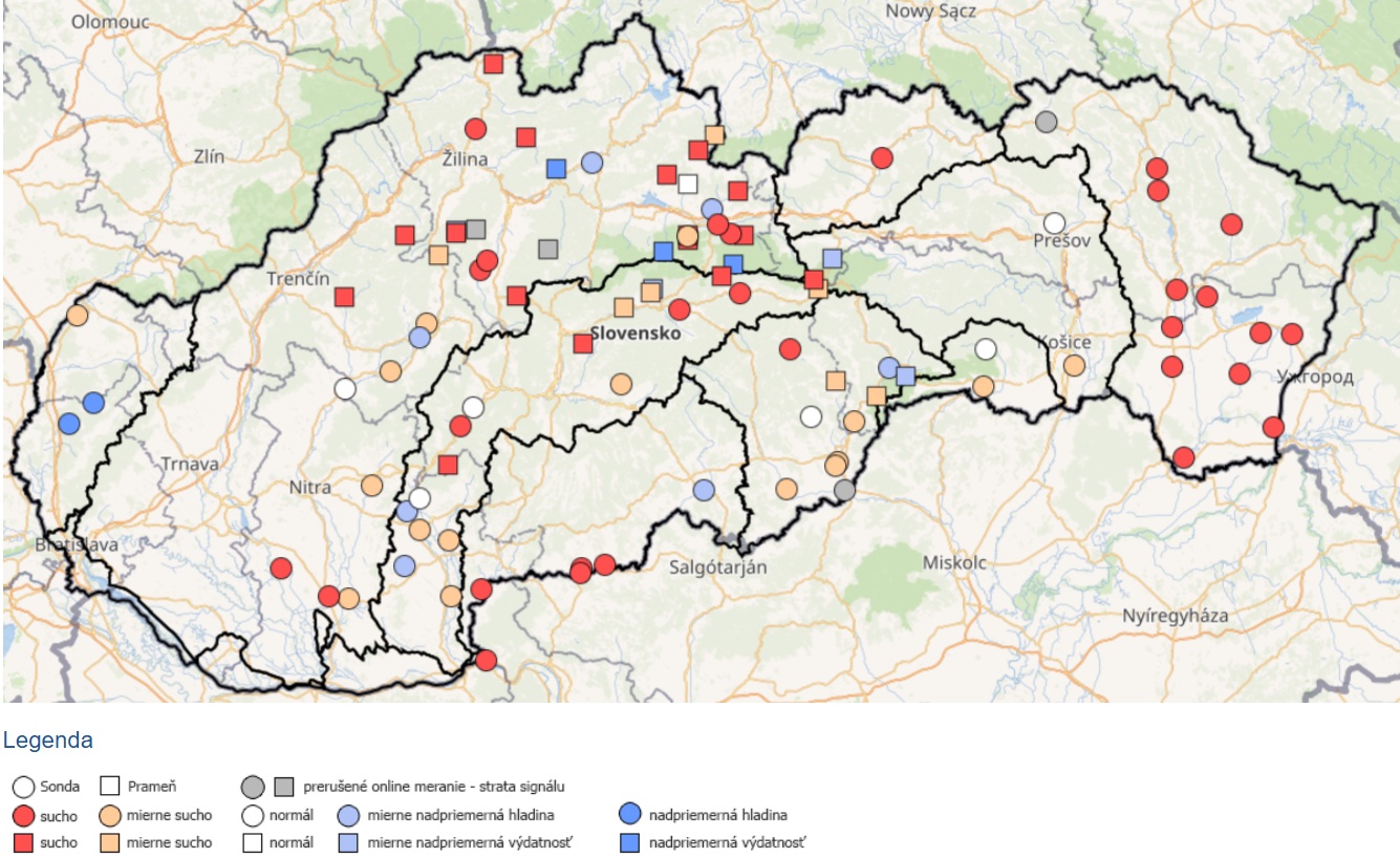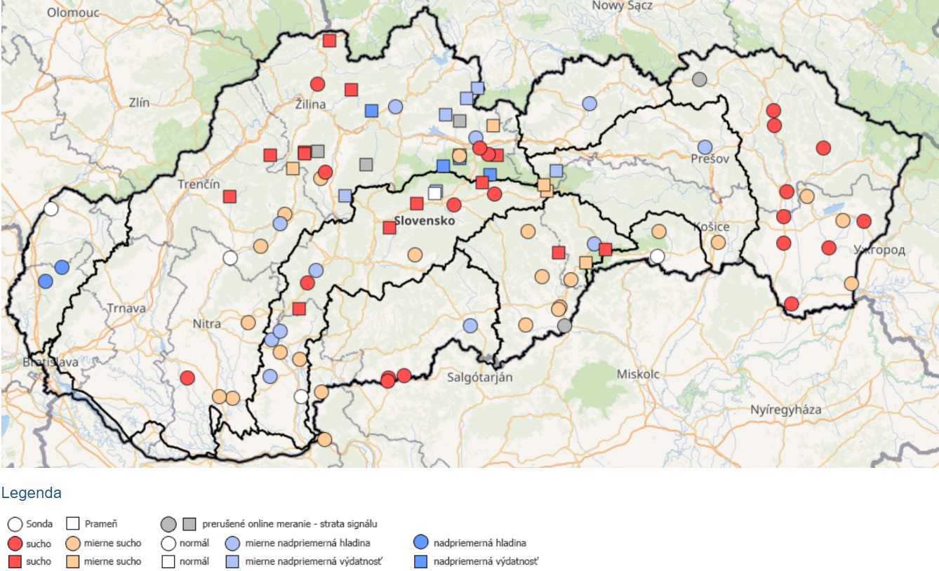 Oproti začiatku mesiaca sme na konci mesiaca zaznamenali pokles hladiny podzemnej vody a výdatnosti prameňov u takmer 82 % zo všetkých hodnotených objektov. Mierne zlepšenie situácie v podzemnej vode sme zaznamenali v povodí Slanej (Obr. 9).