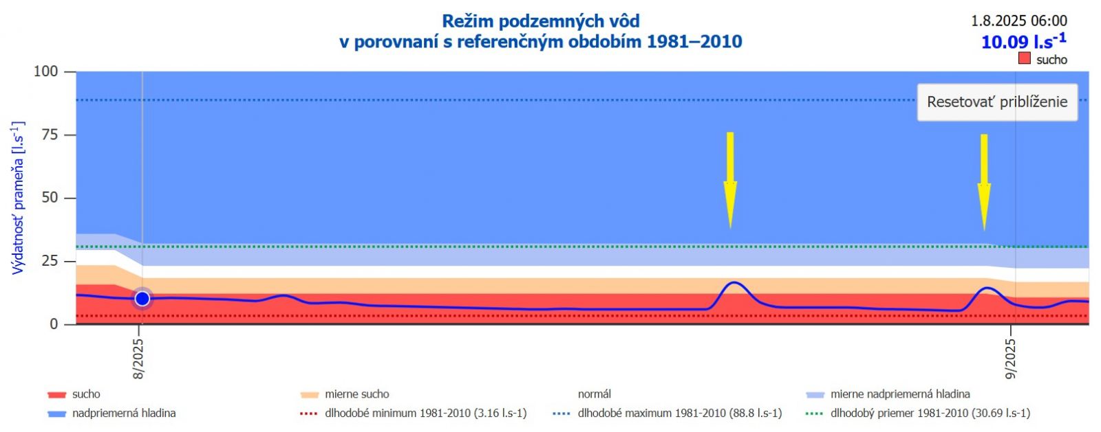 Kým v predošlom mesiaci júl sa vyskytovali atmosférické zrážky relatívne pravidelne, v mesiaci august prevládali dlhšie obdobia s minimálnymi úhrnmi zrážok, ktoré boli prerušované krátkodobými, ale významnými zrážkovými udalosťami (3). Mimoriadne zrážkové udalosti v podobe intenzívnych lejakov na začiatku a na konci poslednej dekády mesiaca nemali zásadný vplyv na dopĺňanie zásob podzemnej vody. Lokálne zvýšenia hladiny podzemnej vody a výdatnosti prameňov boli len prechodné (Obr. 8).