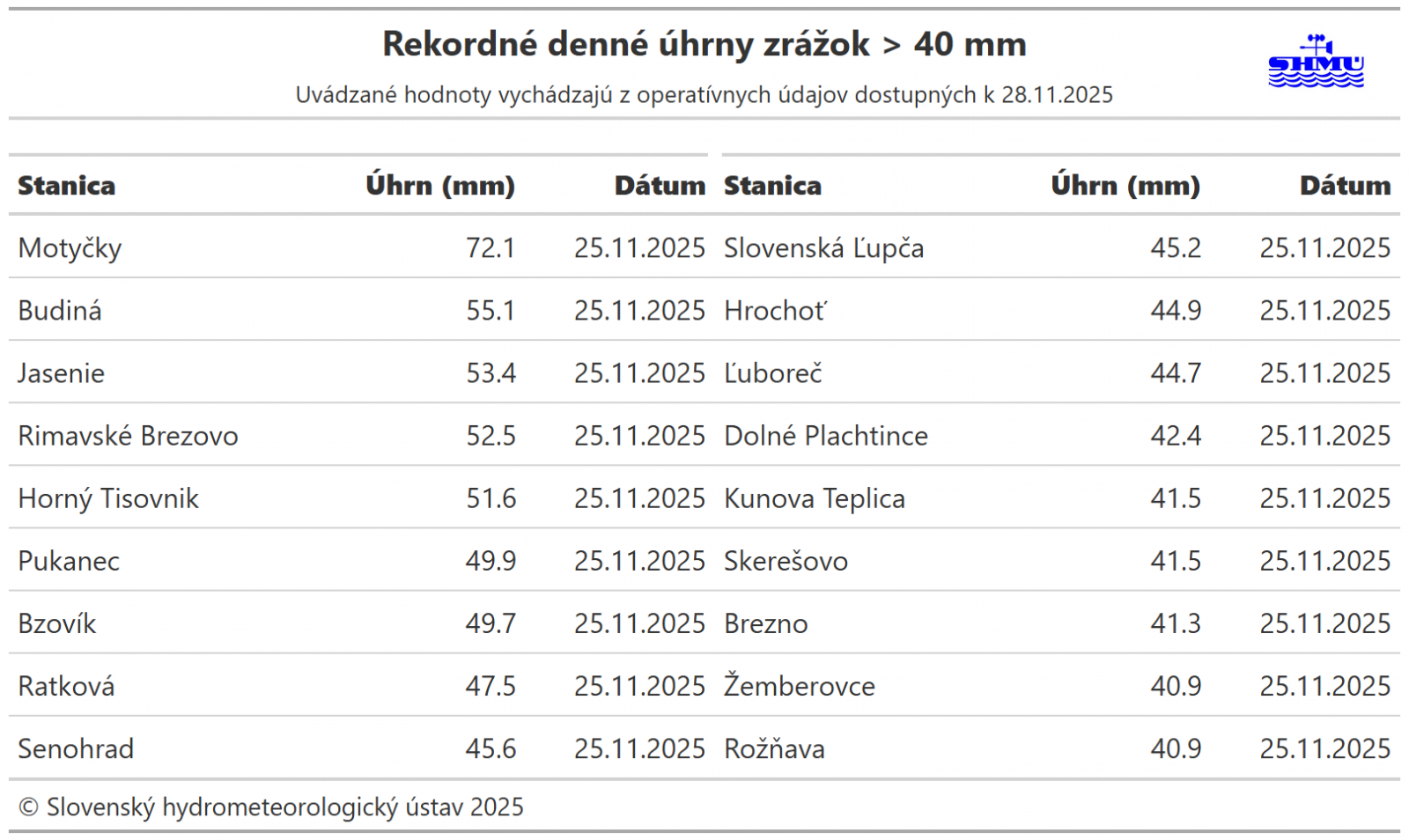 Rekordné denné úhrny úhrny zrážok, z priebežne dostupných údajov, sa sústreďovali 25.11.2025, predovšetkým do južnej polovice stredného Slovenska a priľahlých oblastí na juhozápade východného Slovenska. Mimoriadne vysoké alebo aj rekordné dvojdenné úhrny zrážok v období od 24.11.2025 do 26.11.2025 boli tiež zaznamenané v podobných regiónoch Slovenska. Najvyššie hodnoty týchto charakteristík zrážok sme uviedli v priložených tabuľkách a znázornili v grafických prílohách.