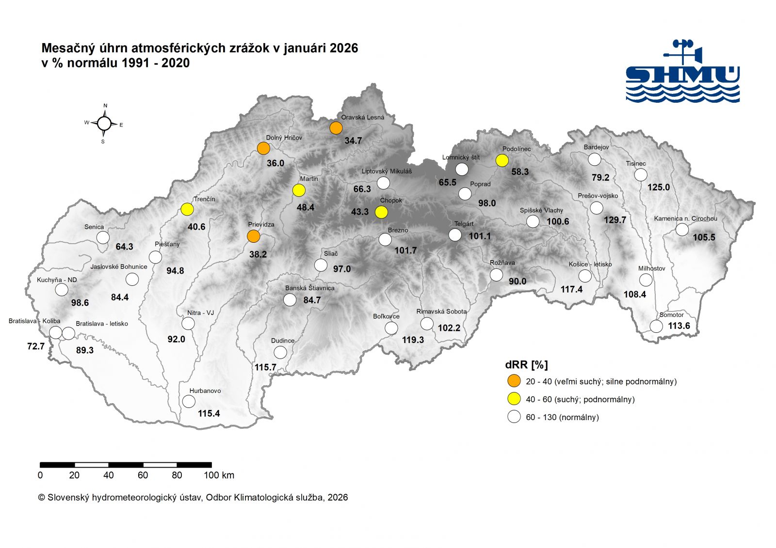 Január 2026 bol na väčšine územia Slovenska zrážkovo silne podnormálny (veľmi suchý) až normálny. Percento normálu 1991 - 2020 mesačného úhrnu zrážok bolo najvyššie 129,7 % v Prešove a najnižšie 34,7 % v Oravskej Lesnej. Najnižší mesačný úhrn zrážok bol nameraný v Gánovciach 15,9 mm. Nízky úhrn zrážok bol aj na staniciach Beluša 16,4 mm, Trenčín 16,8 mm, Dolný Hričov 16,9 mm, Prievidza 17,6 mm, Ihľany-Majerka 17,7 mm, Ružomberok 18,2 mm, Horné Srnie 18,9 mm, Lokca 19,1 mm, Žilina 19,2 mm, Rajecké Teplice 19,3 mm, Spišské Vlachy a Vrbovce 19,4 mm, Holíč 19,8 mm, Skalica a Košecké Podhradie 20,0 mm.