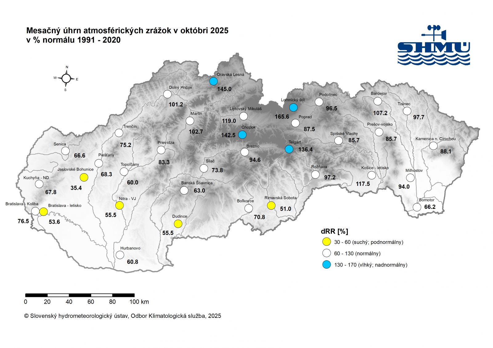 Október 2025 bol na väčšine územia Slovenska zrážkovo silne podnormálny (veľmi suchý) až silne nadnormálny (veľmi vlhký). Percento normálu 1991-2020 mesačného úhrnu zrážok bolo najvyššie 198,0 % v Demänovskej doline-Jasnej a najnižšie 28,7 % v Trnave-Bielom Kostole.