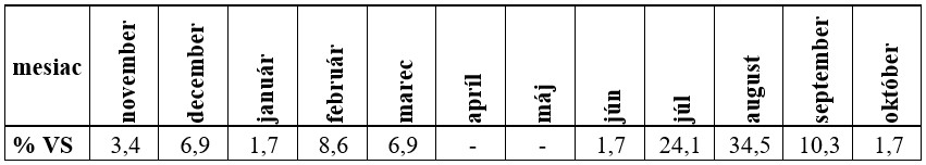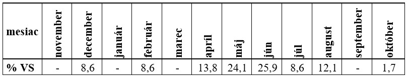 Kulminačné prietoky sa najčastejšie vyskytovali v marci (22,4 %) a v októbri (36,2 %) (Tab. 8).