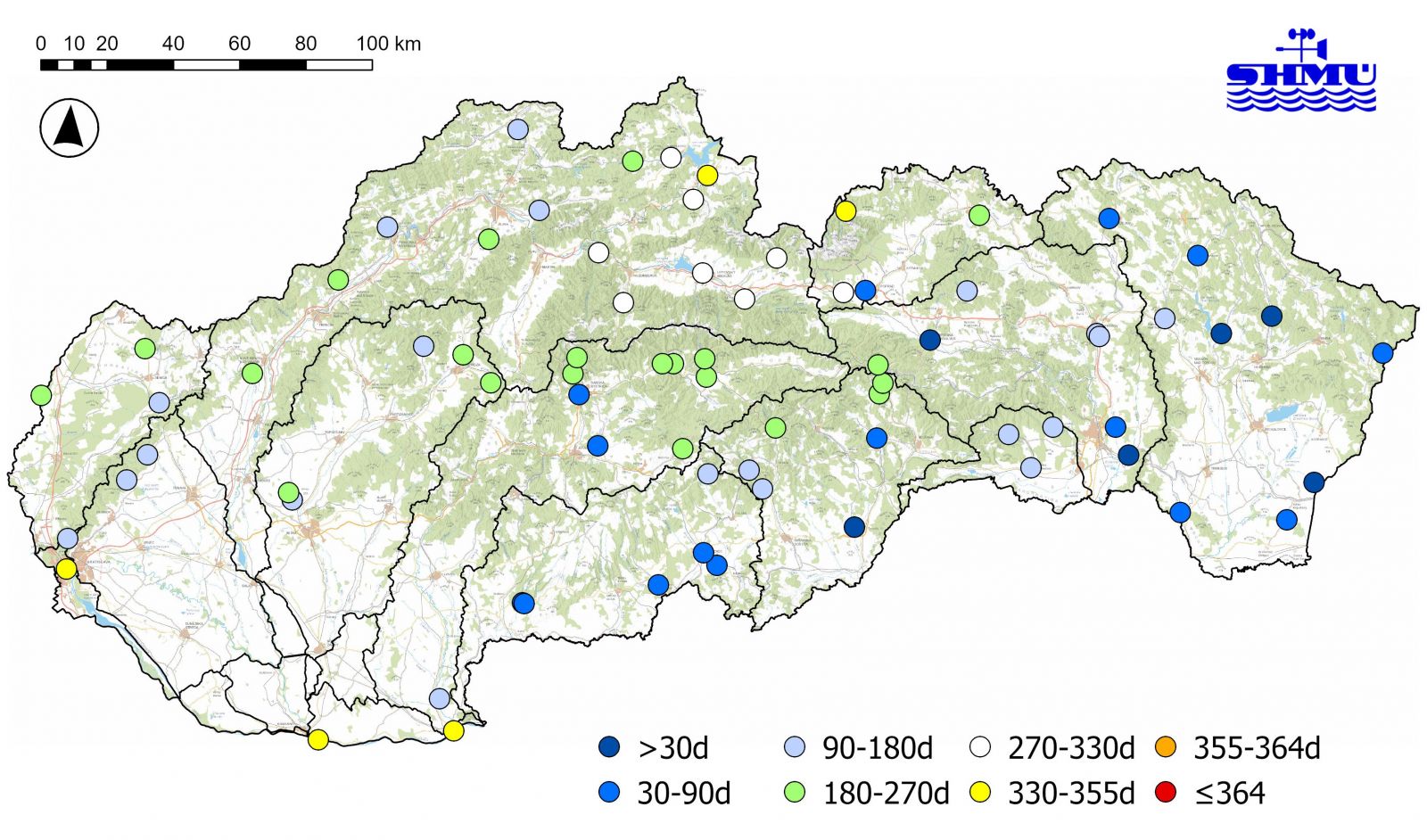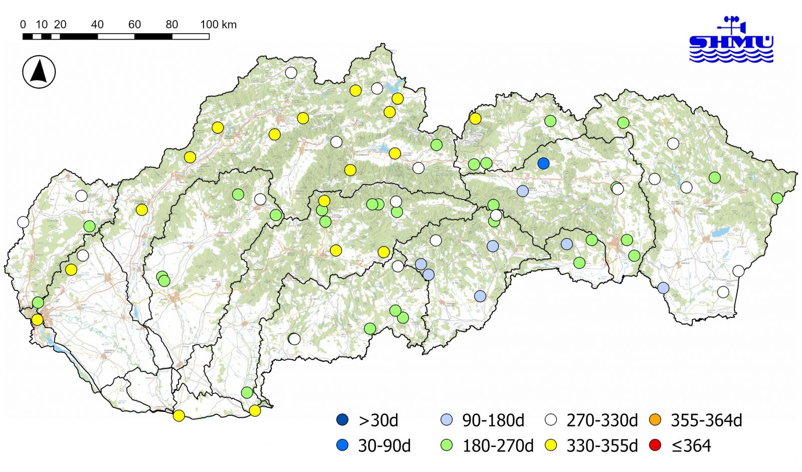 Na konci tretej dekády vo VS v povodí Dunaja naďalej prevládali hodnoty Qd odpovedajúce kategórii podnormálnej vodnosti, avšak v povodí Moravy, horného Hrona a Váhu, v oblasti Bielych Karpát, a v subpovodí Nitry vo VS boli dosiahnuté Qd na úrovni 180-270-dňového prietoku. Vo VS v subpovodí Malého Dunaja, Bodvy a miestami v povodí Slanej a Hornádu boli dosiahnuté hodnoty Qd na úrovni 90-180-dňového prietoku (odpovedajúce kategórii mierne nadnormálnej vodnosti) a v povodiach Ipľa, Hornádu a Bodrogu boli dosiahnuté Qd odpovedajúce kategórii nadnormálnej vodnosti (Obr. 4).