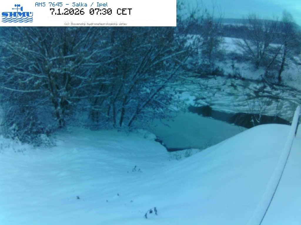 Ešte v úvode roka 2026 sa vplyvom silnejších nočných mrazov začali tvoriť ľadové úkazy, najskôr na menších tokoch. Postupne sa ich výskyt rozšíril aj na väčšie toky – pričom aj na slovenskom úseku Dunaja bol pozorovaný choď ľadových úkazov pochádzajúcich z Moravy. Na dolnom úseku Ipľa sme počas niekoľkých dní pozorovali takmer úplný zámrz rieky (Obr. 5). V závislosti od priebehu počasia dochádzalo k uvoľneniu, resp. zosilneniu ľadových úkazov, ako aj k vzdutiu hladín pri ustálenom prietoku. Ľadové úkazy ovplyvňovali hydrologickú situáciu v takmer všetkých svojich formách počas väčšiny mesiaca.
