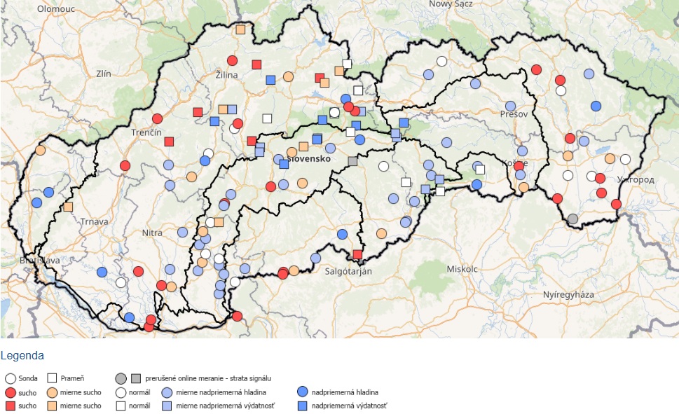 V subpovodí Malého Dunaja a v povodí Váhu, v oblastiach Malých a Bielych Karpát, boli v sledovaných vodomerných staniciach (VS) dosiahnuté hodnoty priemerných mesačných prietokov (Qm) spadajúce do kategórie suchý mesiac (20 - 40 % Qma,1961-2000). V povodí Moravy, Dunaja a v subpovodí Nitry hodnoty Qm v sledovaných VS spadali do kategórie výrazne podnormálny mesiac (40 - 60 % Qma,1961-2000). V povodí Váhu, v oblasti Kysuce a Liptova, v povodí horného Hrona a Ipľa hodnoty Qm vo VS spadali do kategórie podnormálny mesiac (60 - 80 % Qma,1961-2000). Vo VS v povodí Slanej, Bodvy, Hornádu, Bodrogu a Dunajca a Popradu prevládali hodnoty Qm spadajúce do kategórií normálny a nadnormálny mesiac (80 - 160 % Qma,1961-2000) (Obr. 1).
