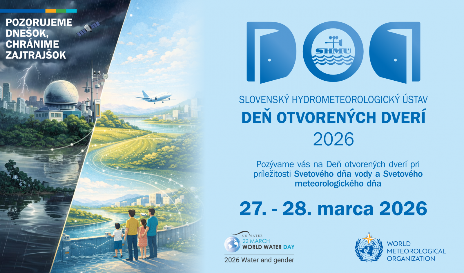 Pozývame vás na Deň otvorených dverí 2026. Uskutoční sa v piatok 27. marca na regionálnych pracoviskách v Banskej Bystrici, v Košiciach, v Žiline a na Aerologicko-radiačnom centre Poprad-Gánovce a v sobotu 28. marca v Bratislave a na meteorologických staniciach: Dudince, Hurbanovo, Lomnický štít, Liesek, Štrbské pleso, Telgárt, Tisinec, Trebišov-Milhostov a na letiskách: Lučenec-Bolkovce, Kamenica nad Cirochou, Nitra-Janíkovce, Prievidza.