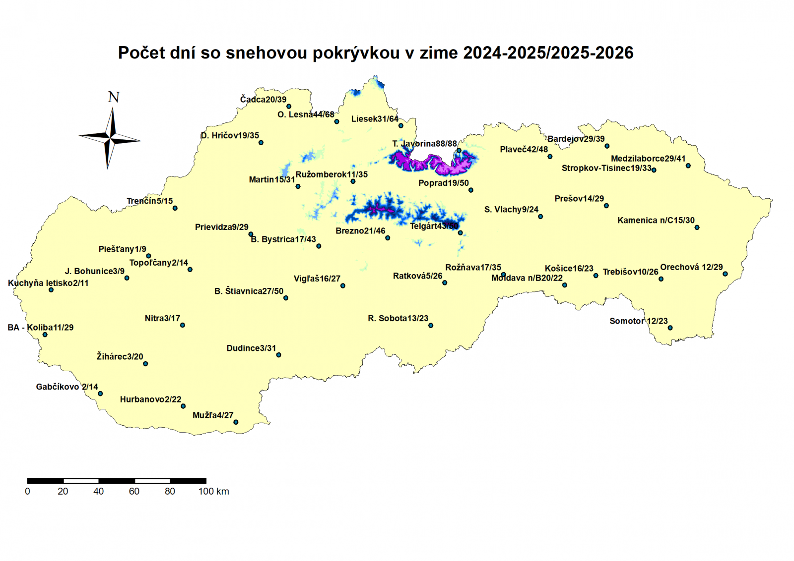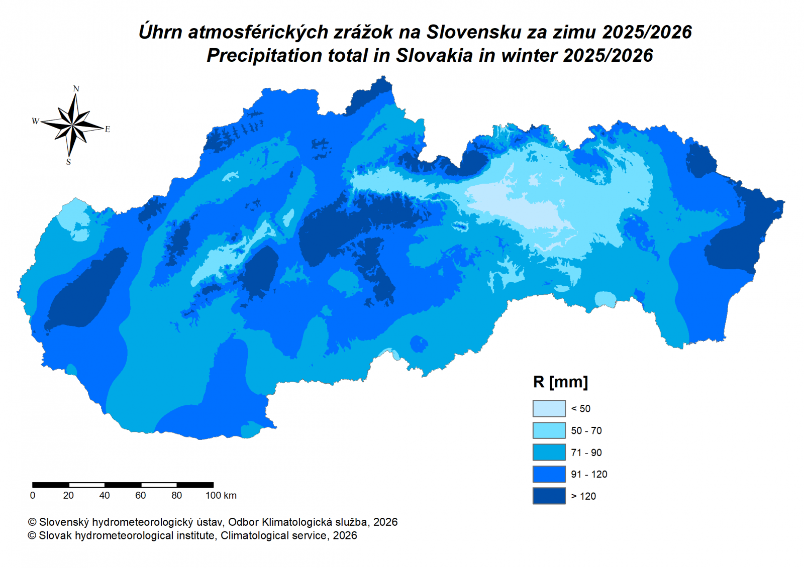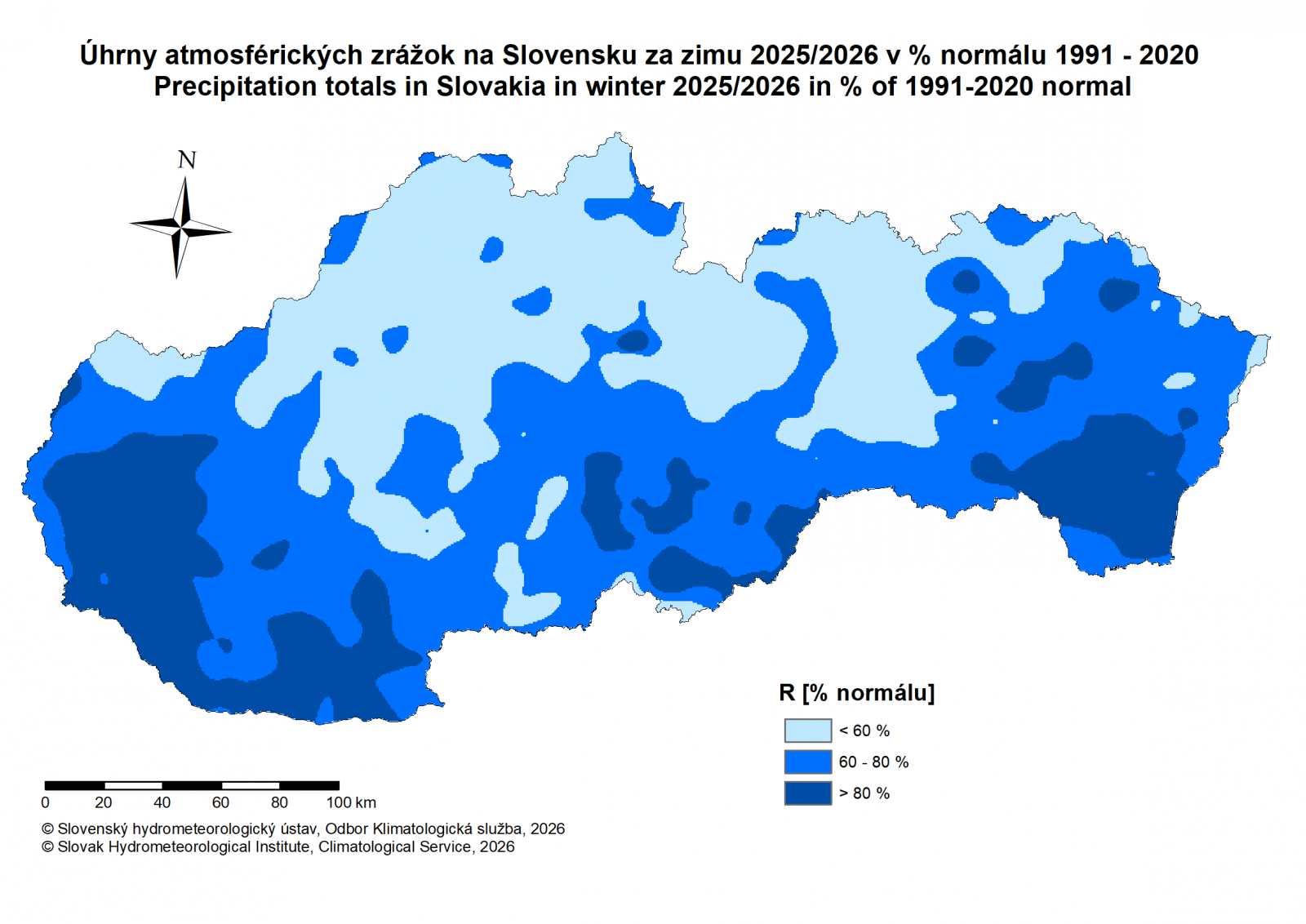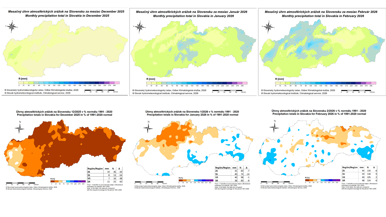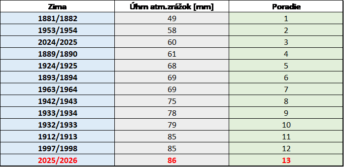 Množstvo zrážok však bolo v nedávno skončenej zime nízke, (13. najchudobnejšia zima na zrážky od roku 1881) , podobne ako v predchádzajúcej zime 2024/2025, (3. najchudobnejšia zima na zrážky od roku 1881), podľa metódy dvojitého váženého priemeru dosiahol priestorový úhrn zrážok pre celé územie Slovenska iba 86 mm a v predchádzajúcej zime 2024/2025 to bolo ešte menej, 60 mm. Je to pozoruhodné, lebo máme za sebou dve zrážkovo výrazne deficitné zimy. V konečnom dôsledku, aj keď bol počet dní so snehovou pokrývkou v poslednej zime vyšší, ako v predchádzajúcej, v súvislosti s deficitom zrážok, prejavil sa aj teraz nedostatok prírodného snehu a preto bola všeobecne aj nižšia vodná hodnota snehovej pokrývky. V určitých horských oblastiach (napríklad Nízke Tatry alebo južná časť veľkej Fatry), síce vodná hodnota snehovej pokrývky vykazovala akúsi stabiltu, ale táto vyplývala ešte z výdatného sneženia v týchto regiónoch na konci minuloročnej jesene (konie novembra 2025).